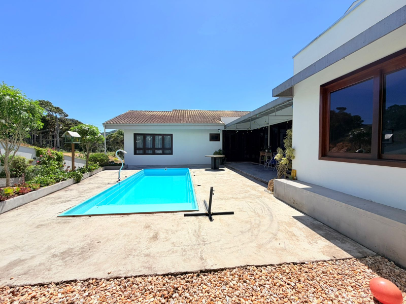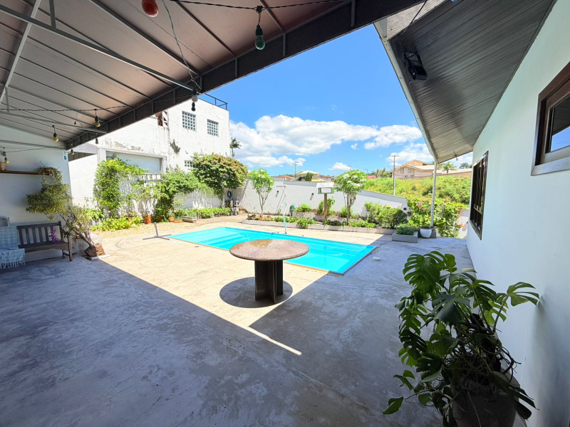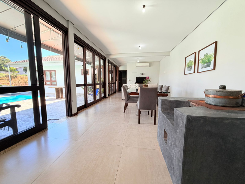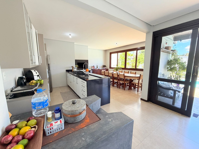 Cozinha reformada com churrasqueira, fogão à lenha e acesso direto para área de festa com piscina.